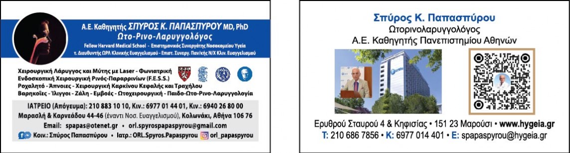 Το απόγευμα, ο ΩΡΛ Α.Ε Καθηγητής Σπύρος Παπασπύρου δέχεται στο ιατρείο του:
